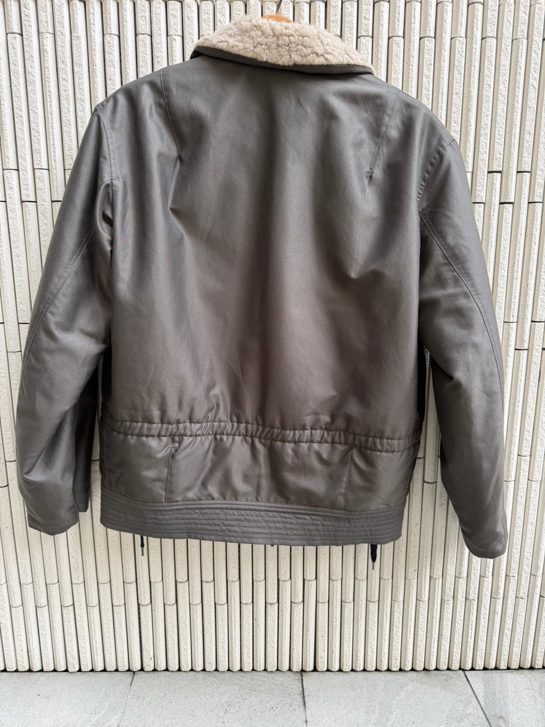 60年代のフランス軍フライトジャケットをベースにデザインしました。オリジナルのコットン生地やファスナーポジションなどから明らかにアメリカ空軍のB15シリーズを研究して作られた感がある1着である。古着のようなマッチョ感を極力薄め、着丈なども着やすく配慮いたしました。襟ボアはウールとヤクのミックスした素材を使用。結果、レギュラーサイジングで仕上がっております。