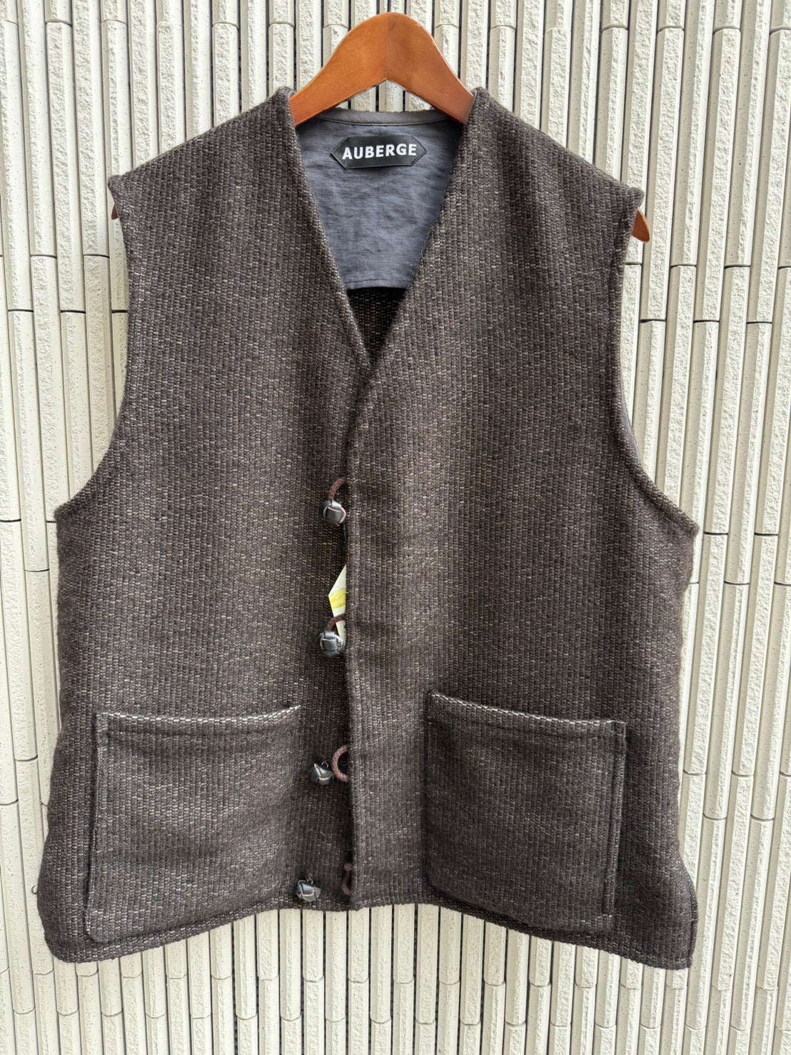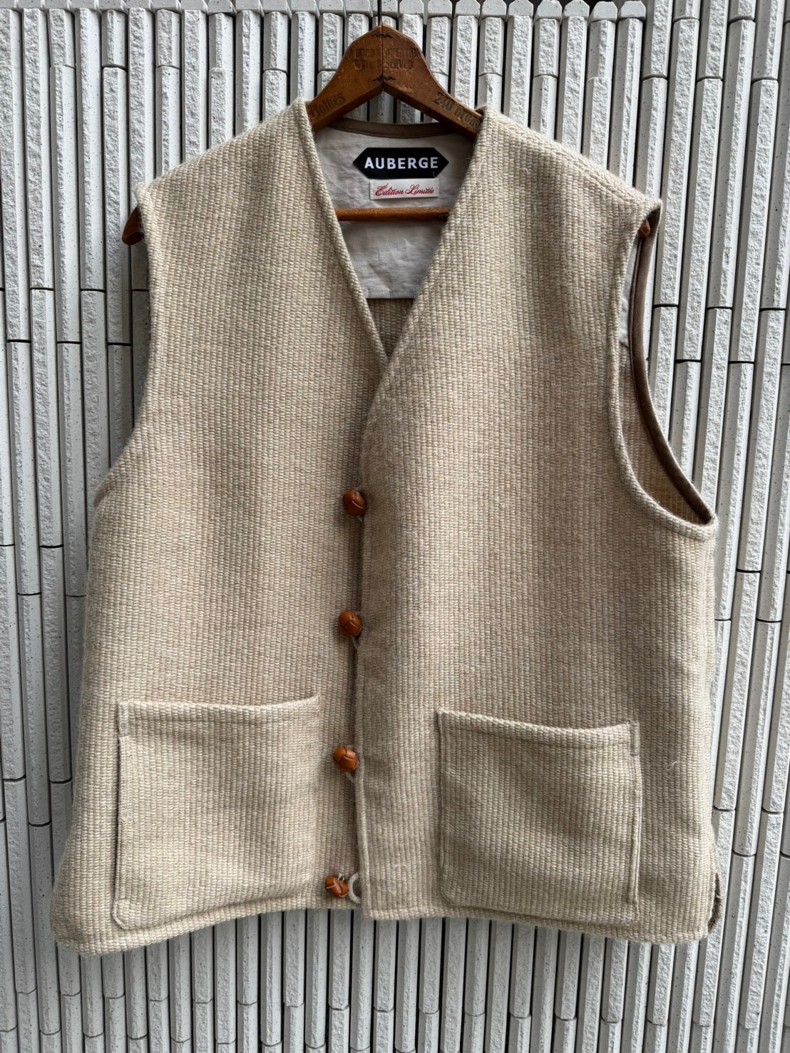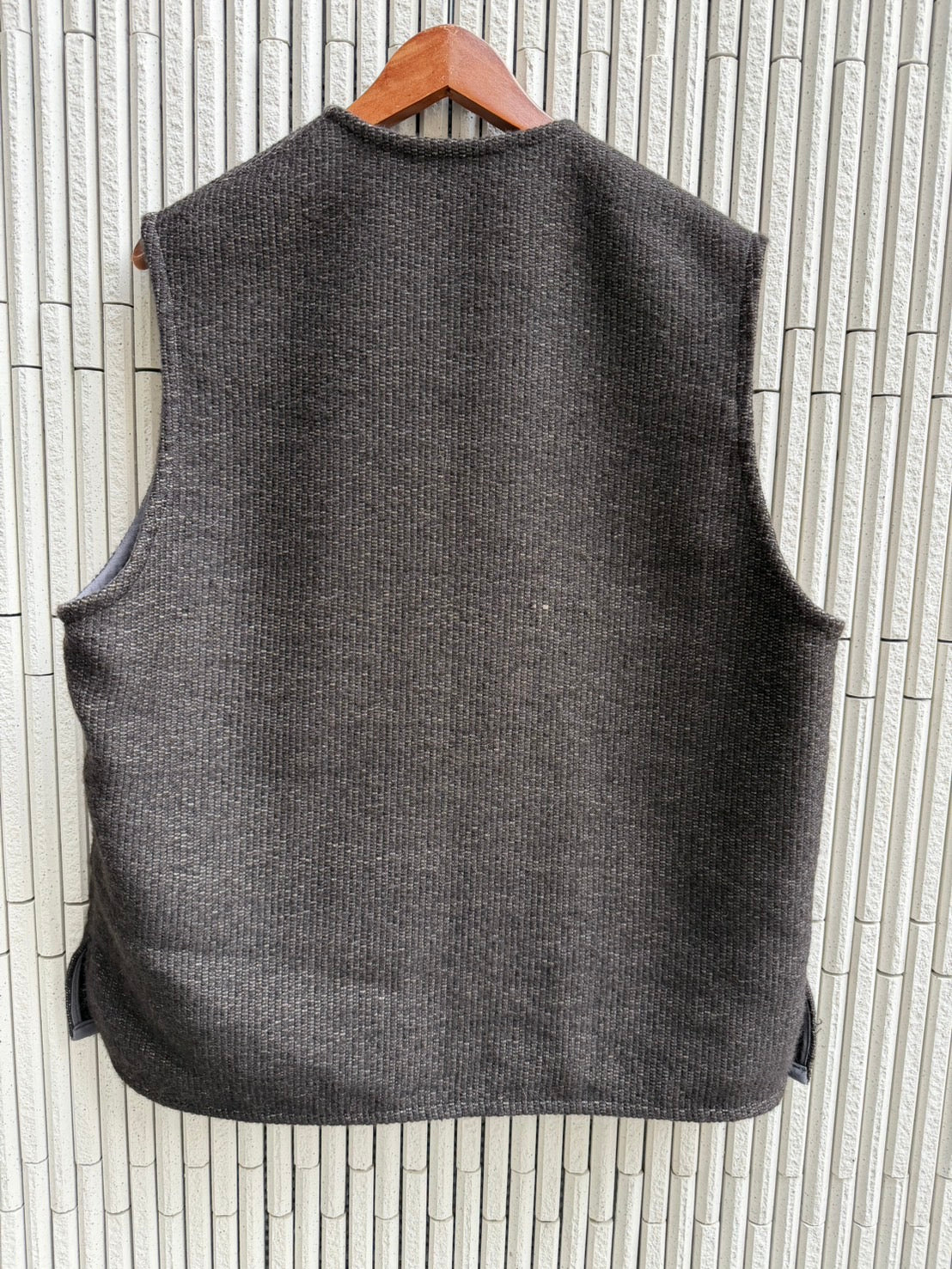 ビンテージのオルテガベストもまた、狭い肩幅、短め着丈とそのまま着ると必ず当時の人的なフィッティングとなってしまう。そこでさまざまなアイテムとのレイヤリングを考え、我々なりの現代版オルテガベストを完成させました。主に肩幅を広めに取り、柔らかく片線に馴染む肩傾斜で仕上げました。アームホールも若干広めにとり、さまざまなレイヤードに対応できるように設計しました。