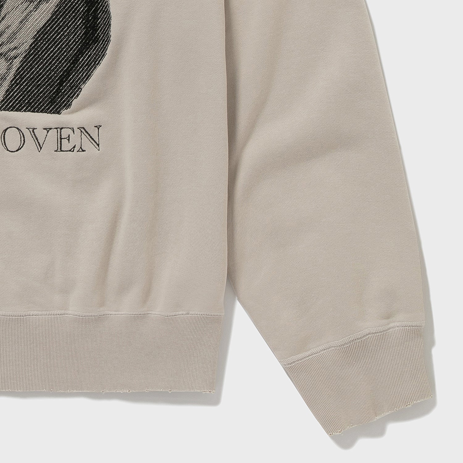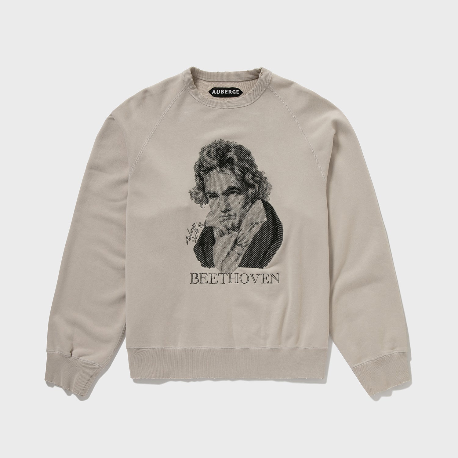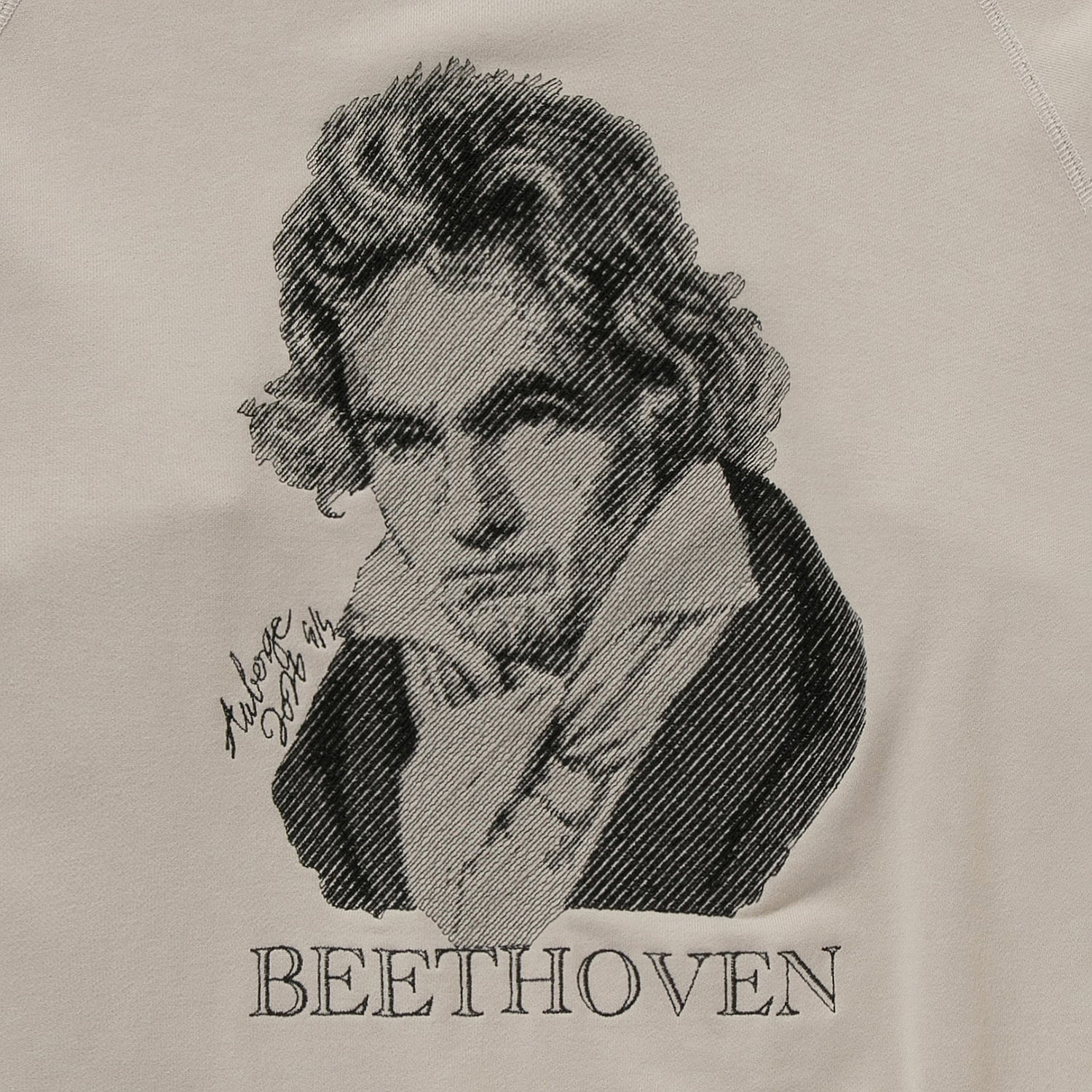 胸元のベートーベンはなんと刺繍で表現されている。これはAUBERGEがしばしば採用する写真画像を地震計の針のような動きで再現する桐生の刺繍工場の技術である。ちょっとレトロでアート感あふれる仕上がりが毎回気に入っている。ちゃんとこの画像に関してプロダクトライセンス料を支払っての使用である(笑)。あえてベートーベンにしたのは、数多のブランドがこのモチーフに挑み、たいてい刷るだけの中で、このモチーフをジャズスタンダードの名曲に見立てAUBERGEならこう演奏する、そんな気分のアプローチなのである。なので有名スタンダードネタである必要があった。