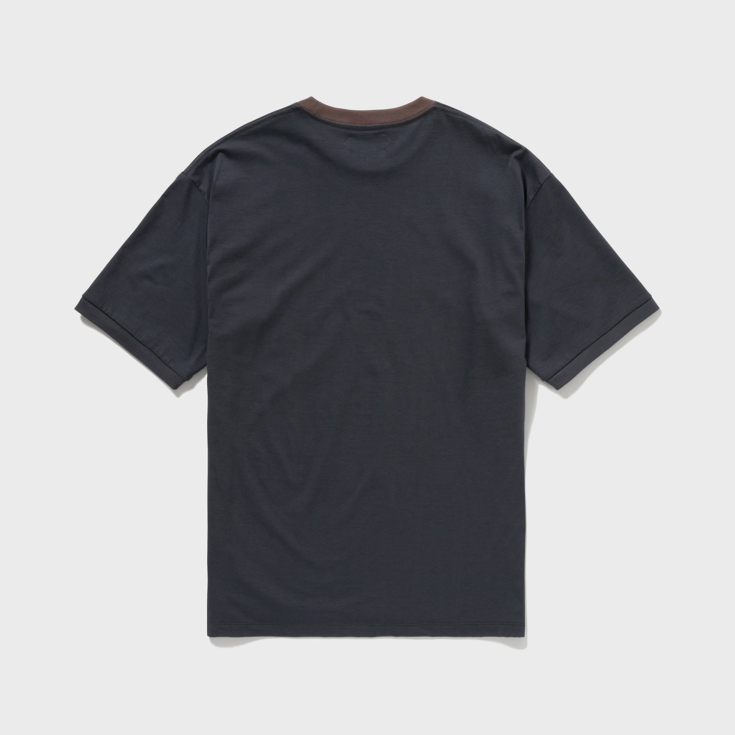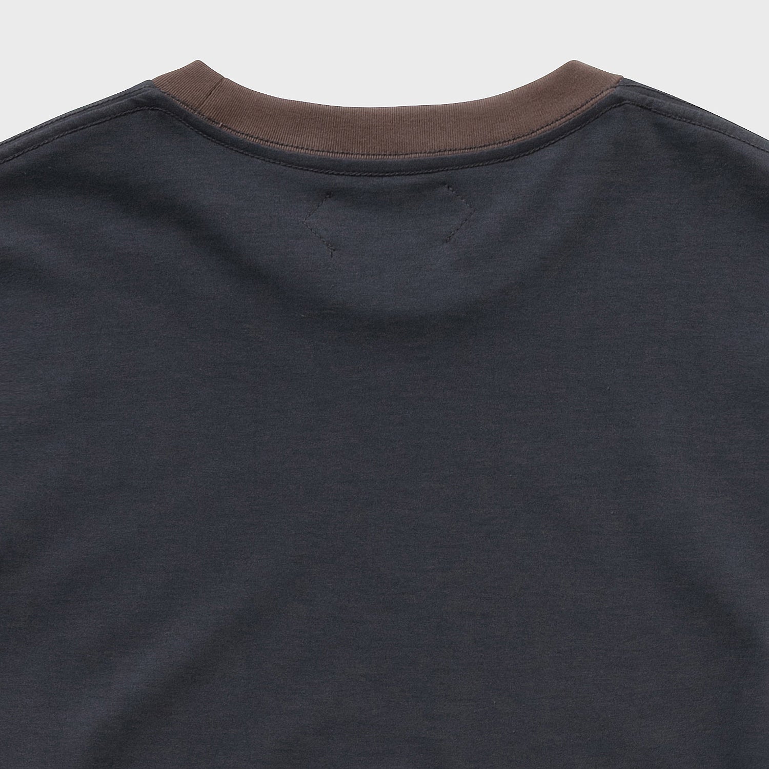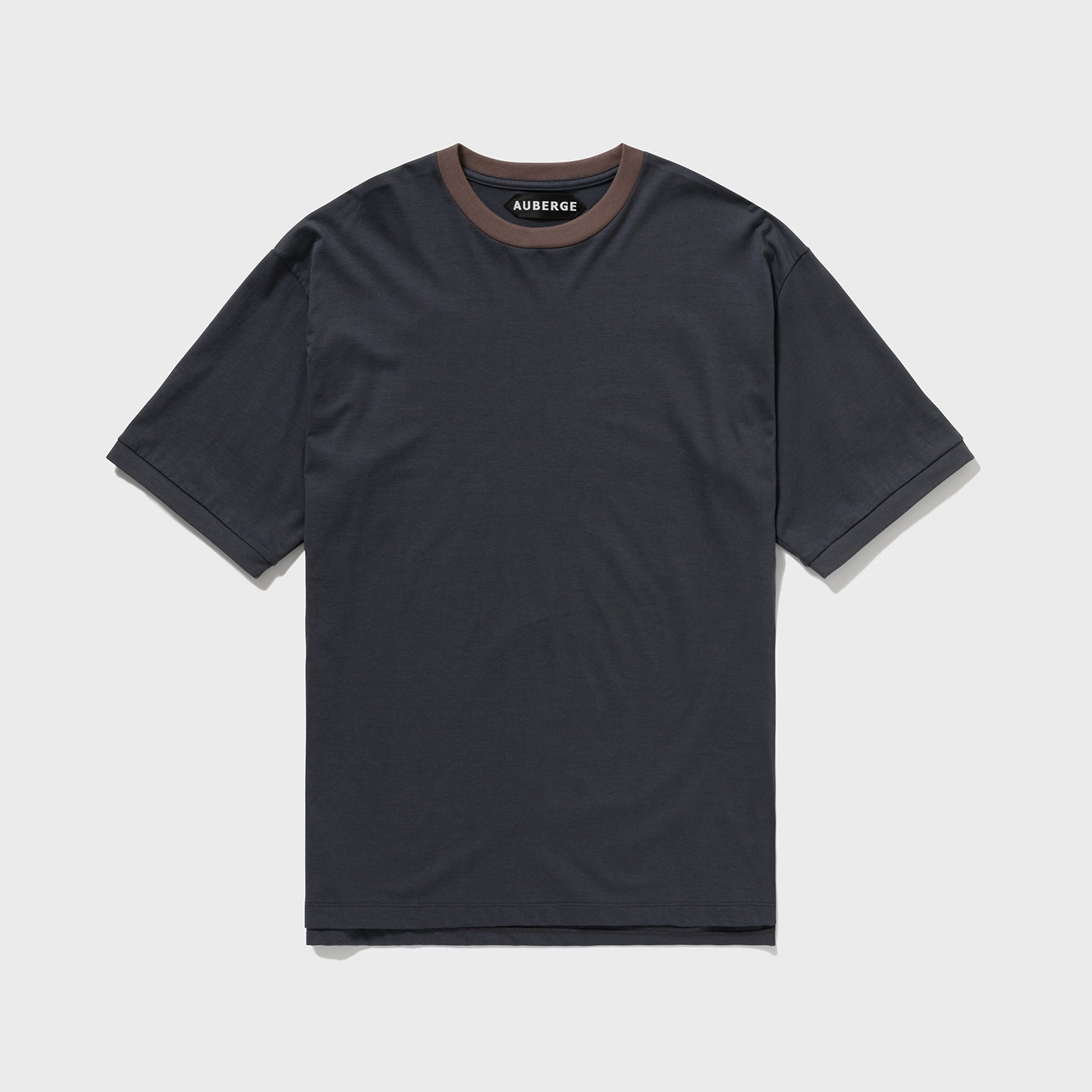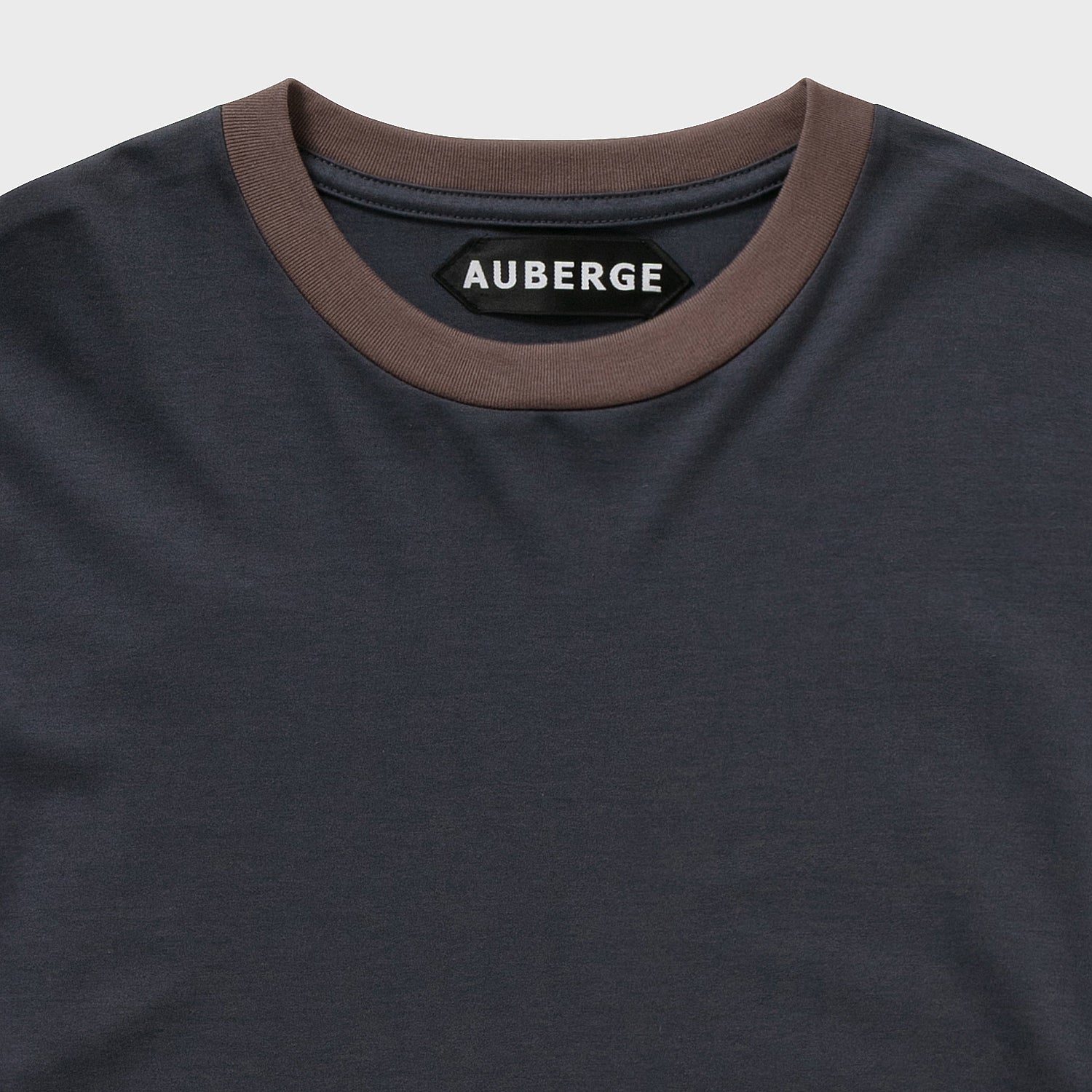 AUBERGEで最もシンプルなクルーTで、かつてJAZZの刺繍モチーフを入れた型を使用。ネックのフライスのみを配色にしたトリム、リンガーデザイン。袖口まで配色するとアメリカ的になりすぎるため、ネックのみの配色としました。