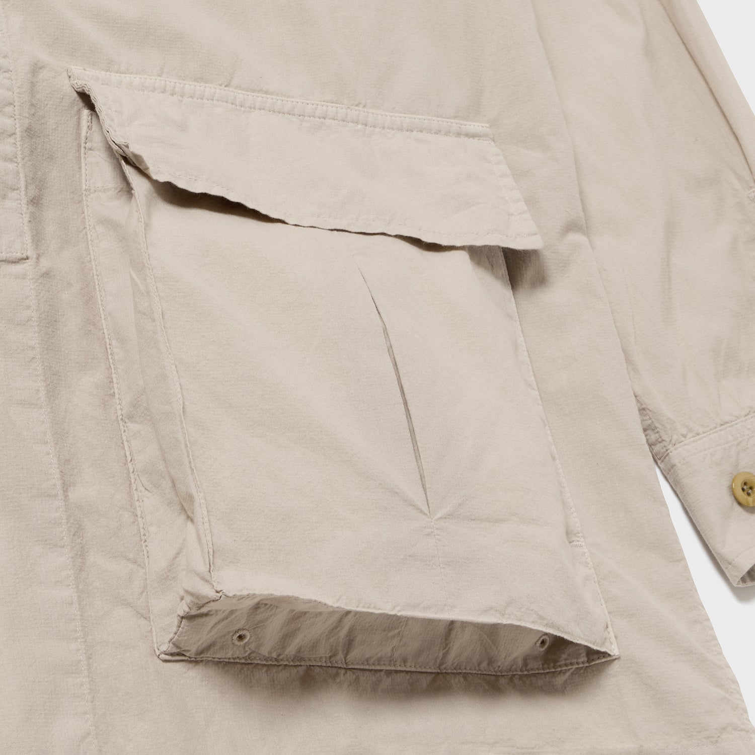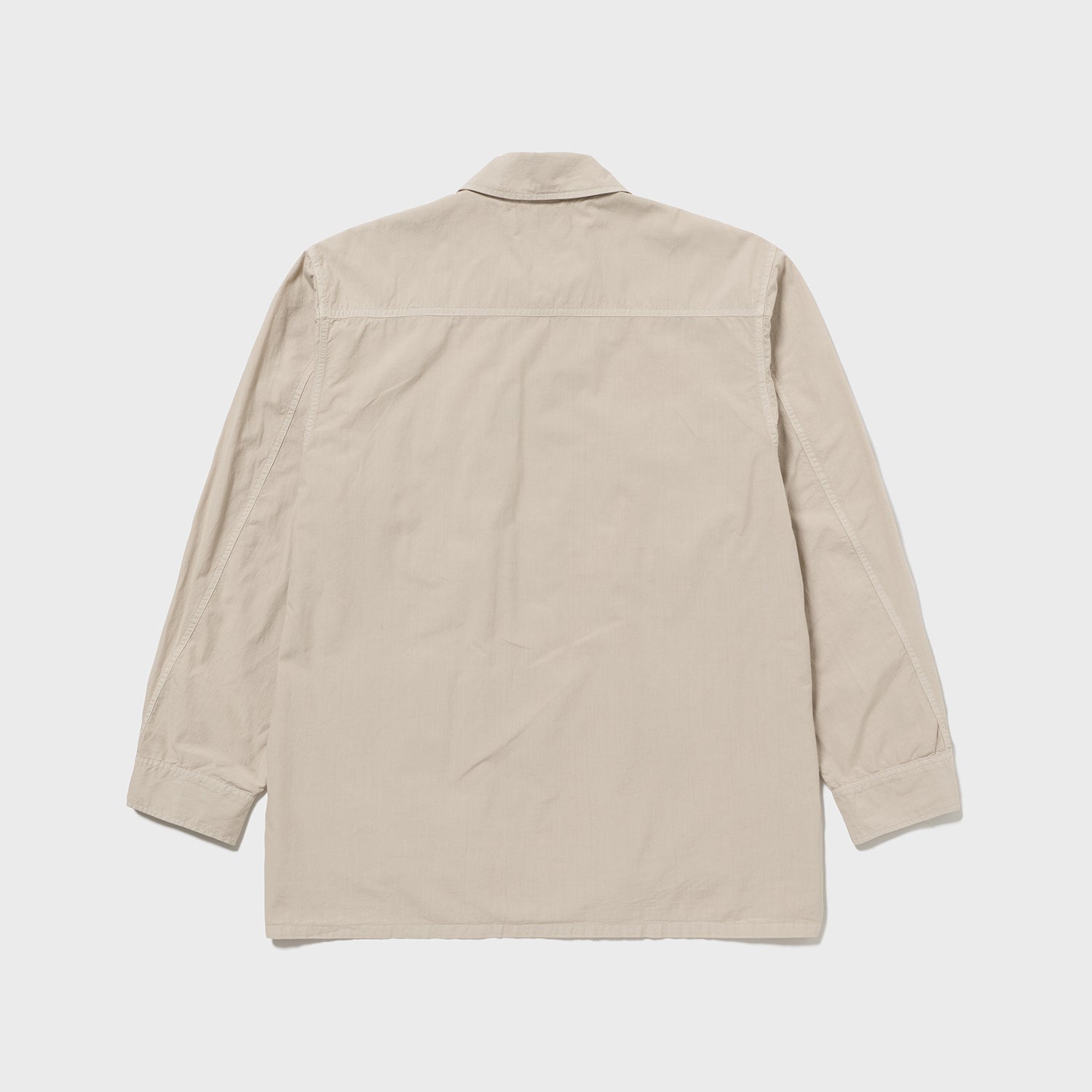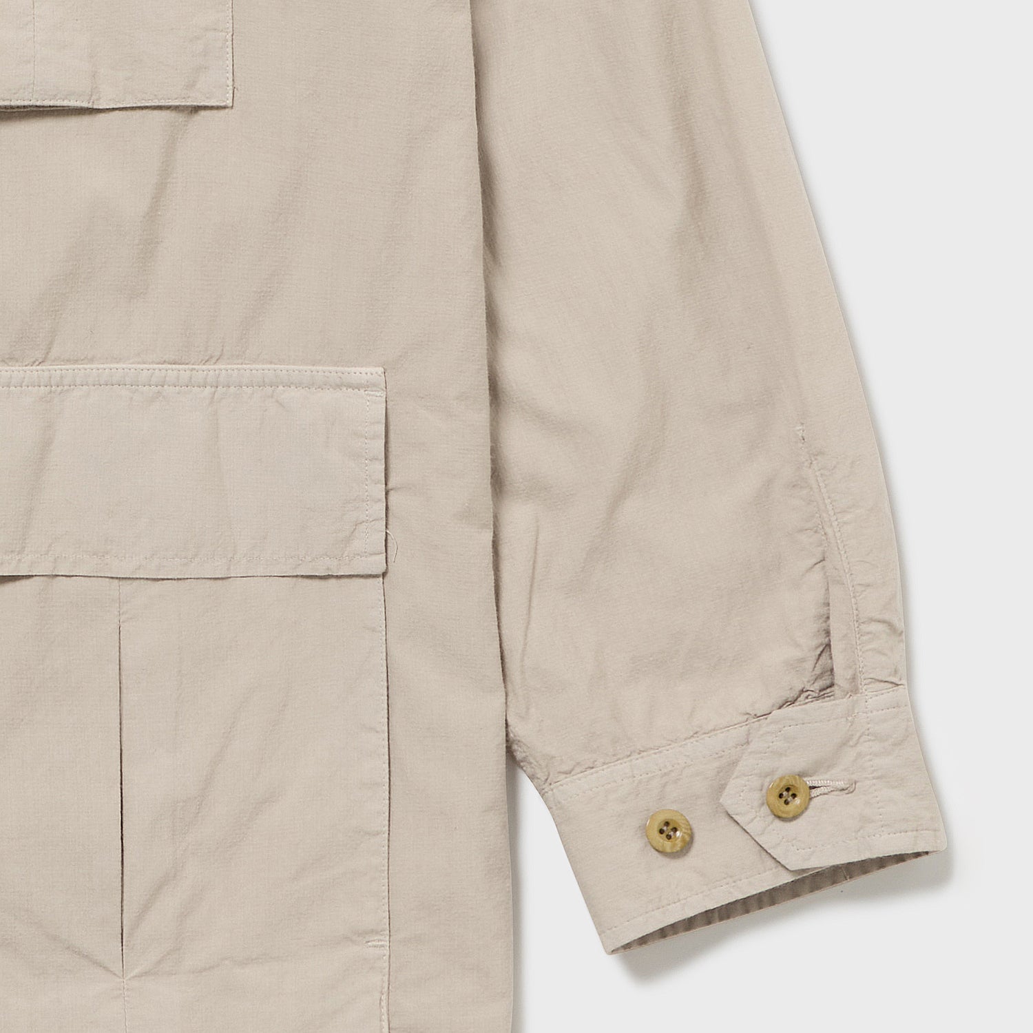 当初のイメージでは、ベトナム戦争期のジャングルファティーグがマッチすると考えましたが、輩感が強めに出るため、今回はカラー・デザインともに少しナイーブなシャツ生地で作ったライトミリタリーを目指し、80年代の海兵隊4パッチJKに仕立てました。